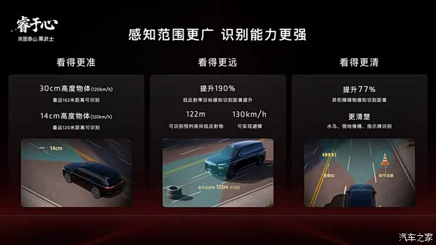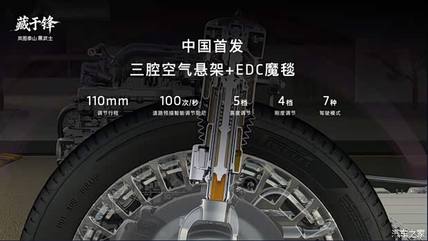 外觀部分,泰山黑武士版純黑色車漆搭配全套熏黑套件營造暗藏鋒芒的整體基調(diào),玄鏡萬象格柵采用全鏡面高光黑化工藝打造,周圍景色在鏡面上流轉(zhuǎn)映照,隱喻俠者面對周遭繁雜而巍然不動的霸氣;天地星芒輪轂經(jīng)10道核心工序加工,采用專屬PVD黑亮鍍膜工藝提升品質(zhì),將“重”與“靈”完美融合,打造舉重若輕之感。